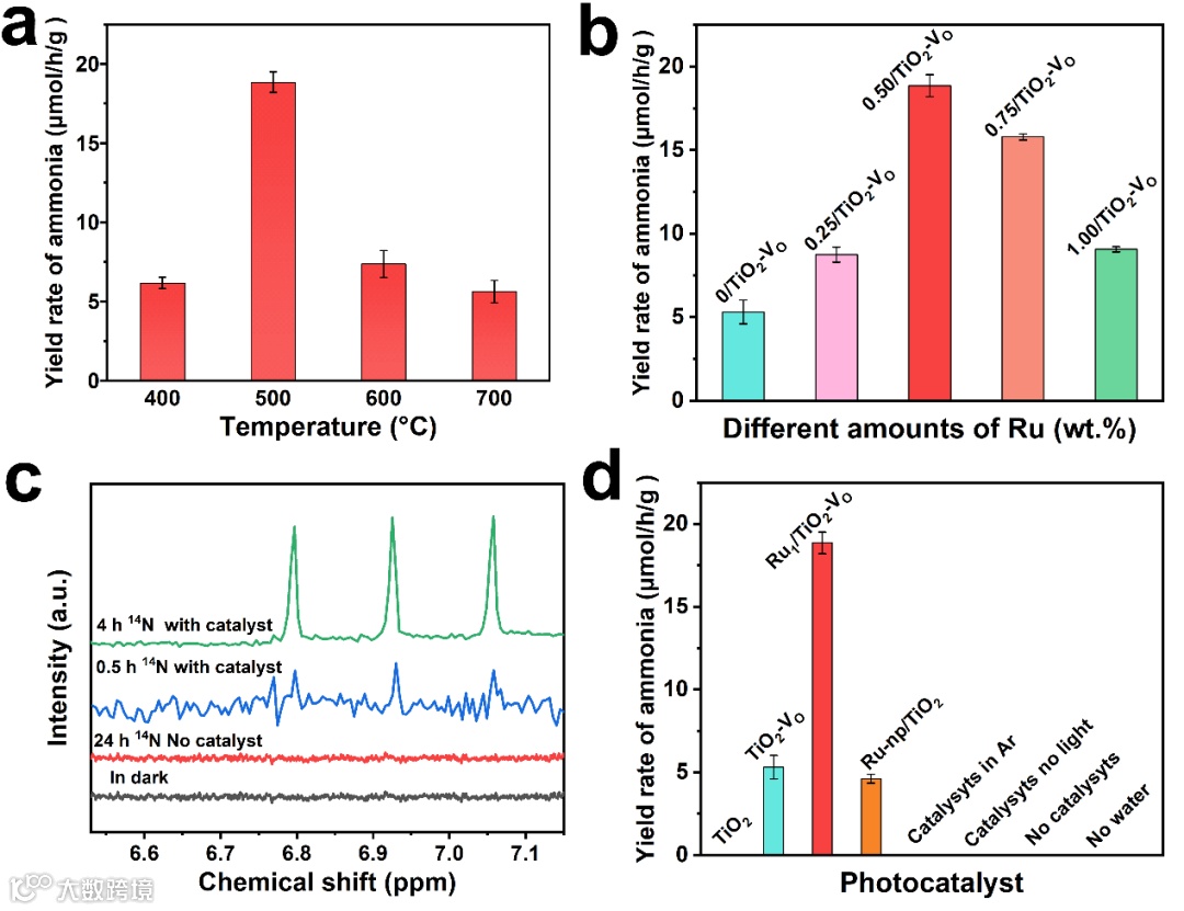 图3. (a)不同熔盐温度(Ru: 0.5 wt.%)和(b)不同样品或不同条件下获得的Ru/TiO2的光催化N2合成氨性能,(c)光催化N2合成氨反应后的1H核磁共振(NMR),(d)不同Ru含量样品的光催化N2合成氨性能