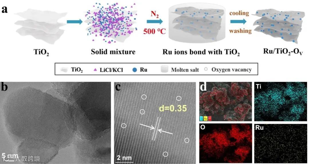 图1. (a)基于熔盐法合成的Ru1/TiO2-VO的制备过程,(b) TiO2的TEM图,(c) Ru1/TiO2-Vo的HAADF-STEM图,(d) Ru1/TiO2-Vo的EDS图