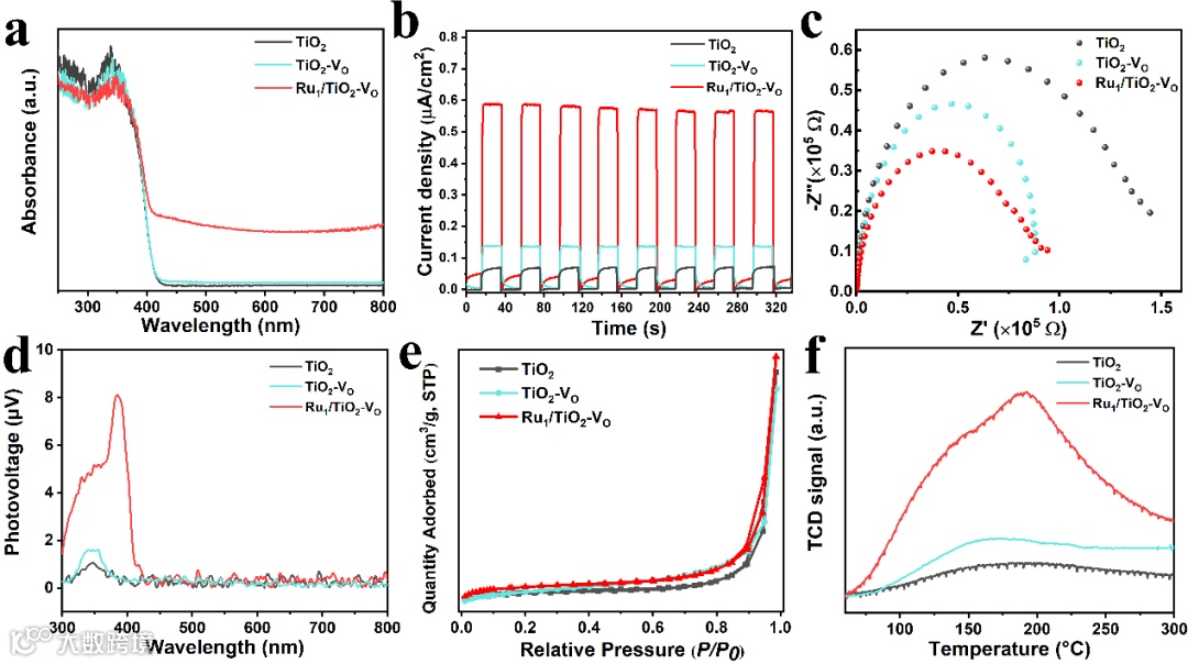 图4. TiO2、TiO2-Vo和Ru1/TiO2-Vo 的(a) DRS光谱,(b)光电流响应,(c) EIS,(d) SPV,氮气吸附-脱附等温线和(f) N2-TPD图