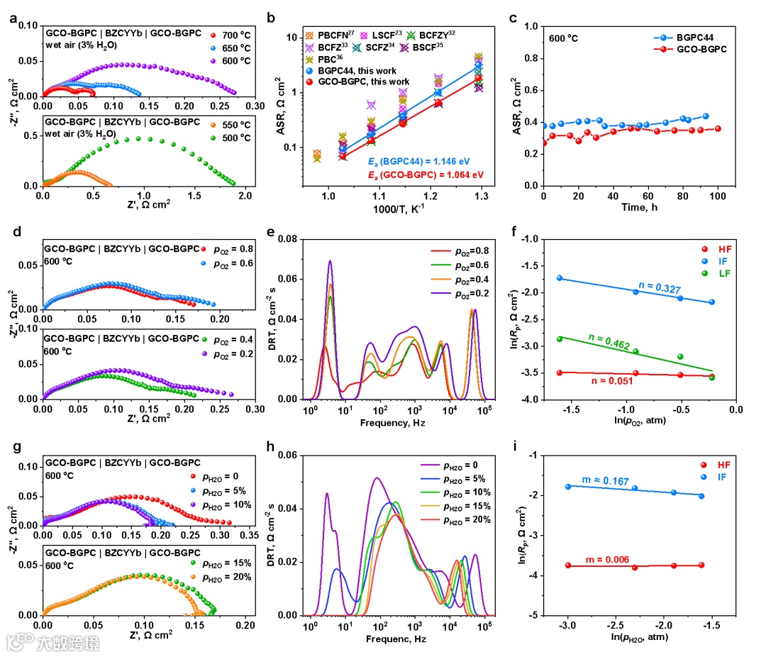 为了评价GCO-BGPC空气电极在不同操作条件下的电催化活性和耐久性,测试了以GCO-BGPC为空气电极,BZCYYb为电解质的对称电池在OCV条件下的典型EIS曲线(图3a)。在700、650、600、550和500℃时的面积比阻抗(ASR)分别为0.07、0.136、0.270、0.667和1.881 Ω cm2,性能优于最近报道的大多数空气电极材料。在600℃,含3%H2O的加湿空气下的ASR短期稳定性测试表明GCO-BGPC空气电极具有良好的电催化稳定性。