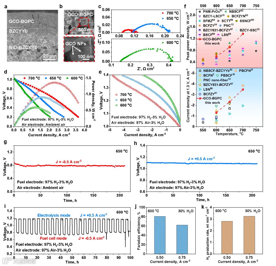 图4a显示了电化学测试前R-PCECs单电池的典型SEM图像。由NiO-BZCYYb多孔燃料电极支撑层(约600μm厚)、致密的BZCYYb电解质层(约10μm厚)和GCO-BGPC多孔空气电极层(约22μm厚)组成。当用作R-PCECs的空气电极时,在600、650和700℃下,分别获得了0.589、0.909和1.365 W cm-2的峰值功率密度(图4d)和1.323、2.336和3.485 A cm-2的电解电流密度(电解电压为1.3V, 图4e)。GCO-BGPC空气电极的电池在燃料电池模式、电解电池模式以及可逆运行模式下均表现出良好的稳定性。