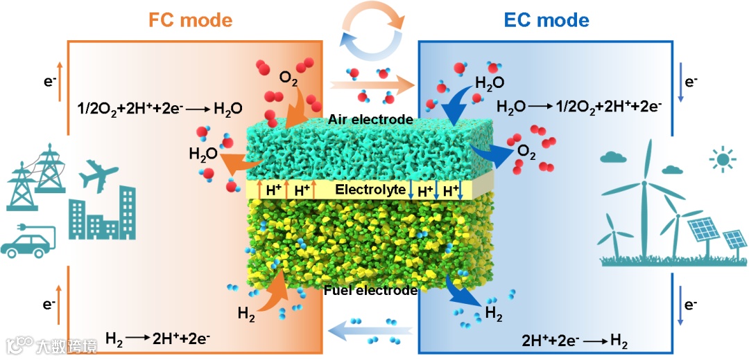 图1. 具有原位形成的GCO-BGPC空气电极的R-PCEC在FC和EC模式下运行的示意图。