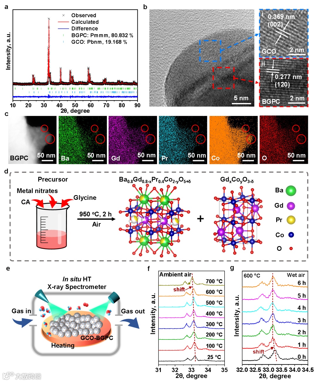此外,在600℃将气氛从干燥空气切换到含3%H2O湿空气后,观察到GCO-BGPC主峰明显左移,特别是在第一个小时(图2g),这可能是由于水蒸气进入晶格导致的晶格膨胀。过程中没有观察到额外的杂峰,表明GCO-BGPC粉末具有良好的结构稳定性。