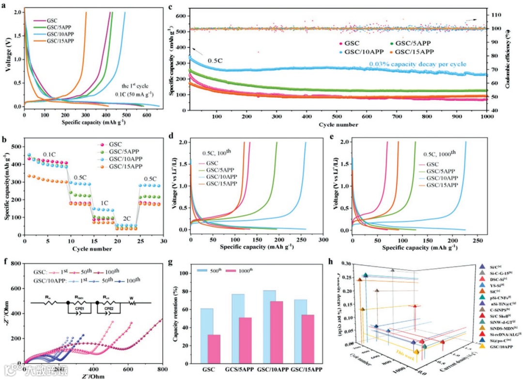 图3 GSC负极电化学性能表征。(a)不同聚磷酸铵添加比例GSC负极0.1C首圈充电曲线;(b)GSC负极倍率性能对比;(c)GSC负极长循环对比;(d)GSC负极0.5C第100圈充放电曲线;(e)GSC负极0.5C第1000圈充放电曲线;(f)GSC与GSC/10APP不同循环圈数能奎斯特图的阻抗对比;(g)GSC负极的第500圈和1000圈容量保持率对比;(h)本工作与其他工作容量衰减率对比。