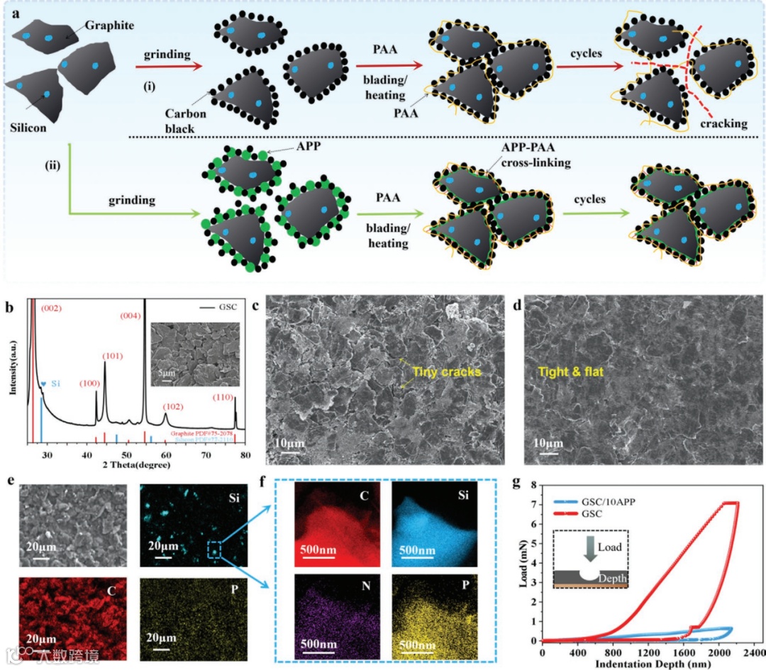 图2 GSC/APP-PAA结构设计与表征。(a)负极制备示意图;(b)GSC复合负极材料XRD图和SEM图(插图);(c)未添加聚磷酸铵APP极片表面SEM图;(d)添加10 wt%APP的负极极片表面形貌图;(c)GSC/APP-PAA表面SEM-EDS图;(f)GSC/APP-PAA局部放大的TEM-EDS图;(g)GSC/PAA与GSC/APP-PAA极片的纳米压痕力学实验。