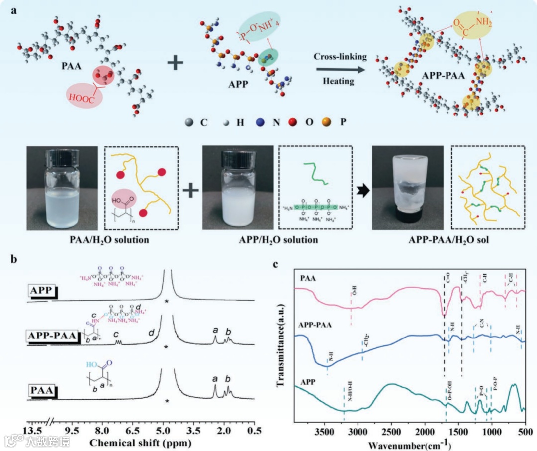本文对聚磷酸铵APP和聚丙烯酸PAA进行升温热处理,制备了交联的复合聚合物(APP-PAA, 图1)。NMR与红外证明,获得了反应后的聚合物存在交联后的特征峰(图1b-c)。