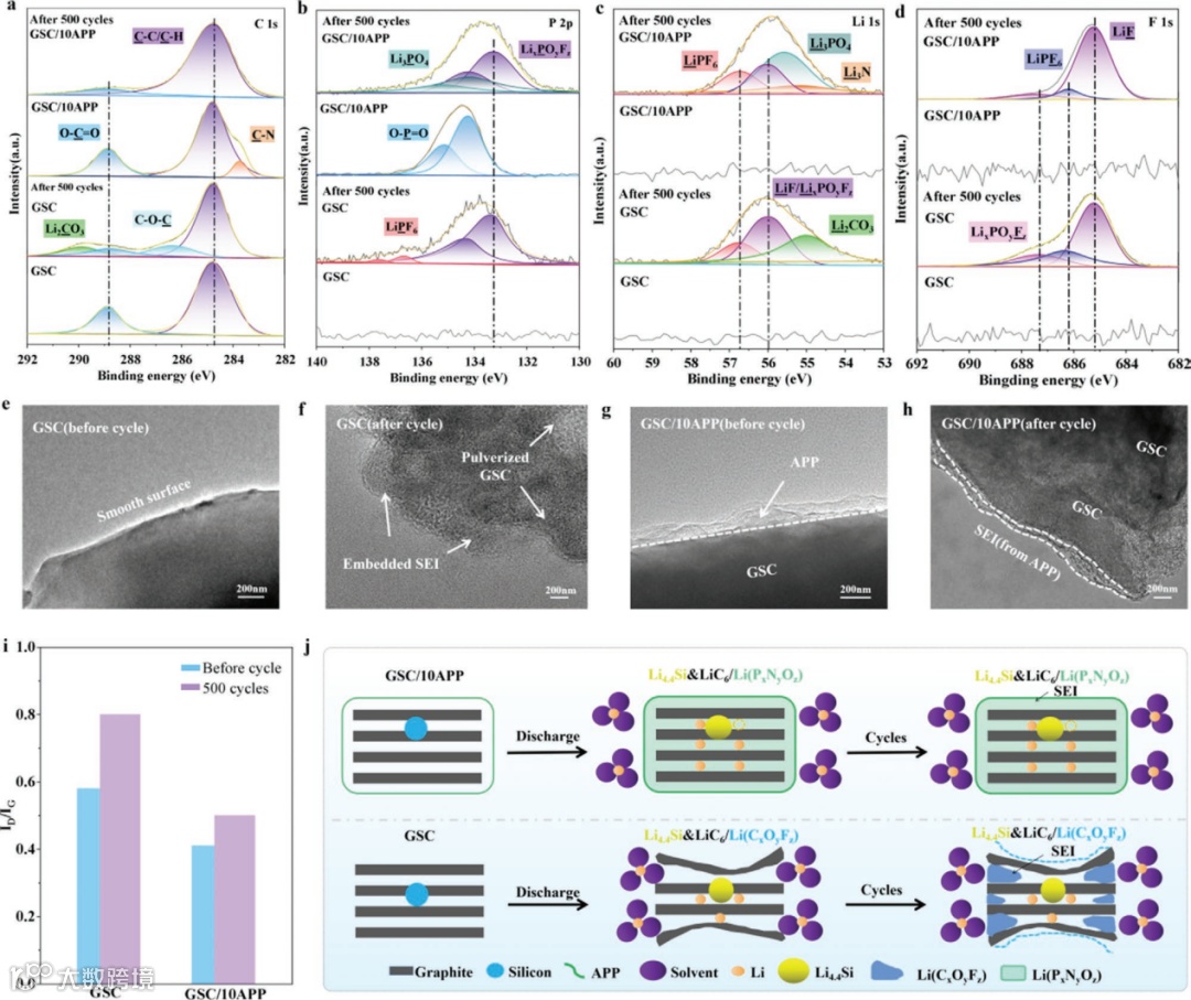 图4 循环后GSC负极结构表征。(a-d)GSC与GSC/10APP循环前后的C 1s、P 2p、Li 1s和F 1s的XPS图对比;(e-h)GSC与GSC/10APP循环前后表面TEM图对比;(i)GSC与GSC/10APP循环前后表面拉曼数据对比;(j)循环过程中GSC和GSC/10APP负极表面SEI形成的示意图。