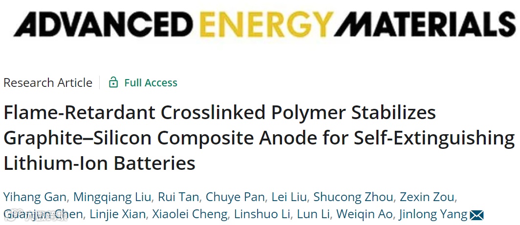 Yihang Gan, Mingqiang Liu, Rui Tan, Chuye Pan, Lei Liu, Shucong Zhou, Zexin Zou, Guanjun Chen, Linjie Xian, Xiaolei Cheng, Linshuo Li, Lun Li, Weiqin Ao, Jinlong Yang*, Flame-Retardant Crosslinked Polymer Stabilizes Graphite–Silicon Composite Anode for Self-Extinguishing Lithium-Ion Batteries. Adv. Energy Mater. 2022, 2202779.