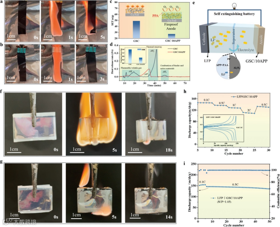 以上结果表明加入聚磷酸铵不仅不会影响GSC负极材料电化学性能,而且会提升GSC负极的循环稳定性。于是,我们对GSC/10APP进行了垂直点火实验和热分析(图5a-d),结果添加阻燃剂的极片能实现快速自熄灭和低的热量释放,提高了GSC负极材料的安全性能。