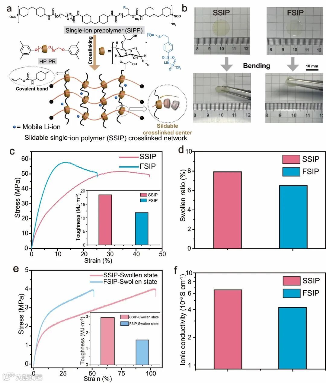 图1. SSIP的合成、SSIP和FSIP实物照片、力学性能溶胀性能以及离子电导率