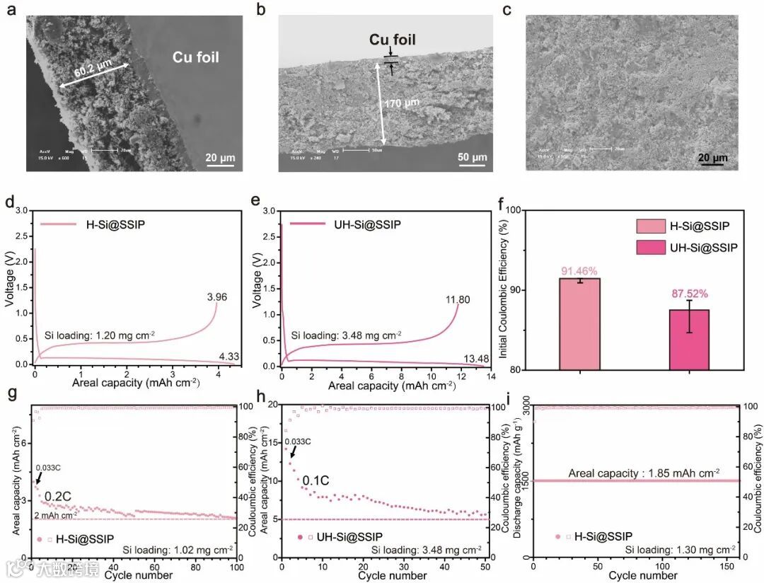 在高面容量下H-Si@SSIP和UH-Si@SSIP也表现出较好的ICE和循环性能,对比已报道的粘结剂工作处于较高水平。使用SSIP粘结剂制备的高ICE高面容量硅负极有望应用于锂离子电池以实现全电池更高的能量密度。