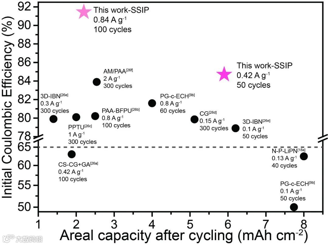 图5. 基于不同粘结剂的硅负极循环后的面容量和ICE