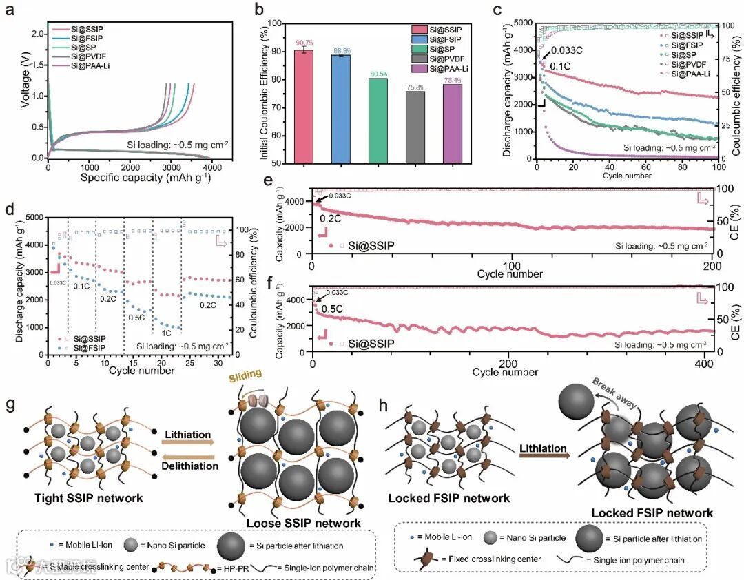 本文中,该课题组结合团队工作特色在单离子型聚合物体系中引入聚轮烷作为滑动交联点,制备了一种具有分子滑轮动态作用的磺酰亚胺锂型聚合物粘结剂(SSIP)。SSIP中P-TFMSI-Li链段具有较强的导离子能力,显著降低了电池内部阻抗,有助于硅负极表面形成稳定的SEI,显著提高电极ICE。SSIP中可逆的分子滑轮作用能够使硅负极较好地适应体积变化,维持电极结构稳定。基于这类粘结剂优异的导离子能力和动态交联特性,硅负极能够在长时间的循环后依然保持较高的比容量。