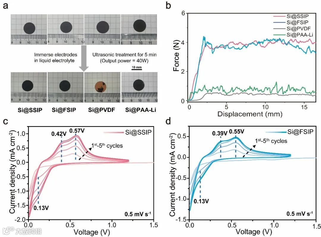 通过超声实验可以从定性角度初步判断SSIP和FSIP粘结剂相比传统的PVDF、PAA-Li具有更好的粘附性。通过万能力学试验机则从定量的角度进一步证明了SSIP和FSIP这类交联型粘结剂的粘附能力。Si@SSIP和Si@FSIP具有相近的剥离力(~4 N),而商用Si@PVDF和Si@PAA-Li剥离力仅0.5 N和1.0N。Si@SSIP和Si@FSIP在0.01V-1.2V的循环扫描中表现出明显的锂化还原峰和去锂化氧化峰,符合结晶硅负极典型的锂化/去锂化特征CV曲线。
