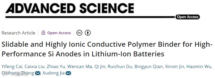 相关研究成果以“Slidable and Highly Ionic Conductive Polymer Binder for High Performance Si Anodes in Lithium-Ion Batteries”为题发表在Advanced Science上。该课题组蔡一枫博士和硕士生刘彩霞为该论文的共同第一作者,张秋红副教授和贾叙东教授为该论文的通讯作者。