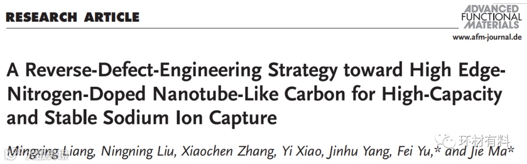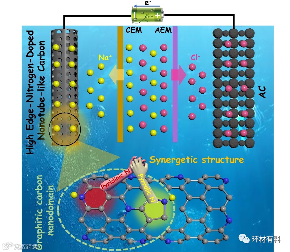 随着人口的增长和工业的快速发展,人类对淡水的需求逐渐增加。陆地淡水资源紧张,区域分布不平衡,而海水和陆地咸水资源丰富,占全球水资源的约97.47%。因此,海水/微咸水淡化技术是解决水资源短缺的重要途径之一。此外,工业用水占城市总用水量的60~80%,而在各国工业类用水中,工业循环冷却水约占工业用水量的70~80%。工业循环冷却水的主要水质特点是高硬度、高含盐等,会对循环冷却系统设备产生重大危害。电容去离子(Capacitive deionization,CDI)技术具有效率高、易再生和易维护等优势,在脱盐、离子分离等领域受到广泛关注。由于成本低、导电性好、资源丰富且容易获取,碳材料被认为是最具有实际应用前景的CDI电极,因而得到广泛应用。然而,脱盐容量低、速率慢、稳定性差等难题制约了其进一步发展。因此,开发高效碳基电极对推动电容去离子海水淡水、工业循环冷却水除盐具有重要意义。有鉴于此,同济大学马杰教授团队和上海海洋大学于飞副教授团队合作,采用逆向缺陷工程策略,制备得到的高边缘型氮掺杂的类管状碳材料,该电极展现了高容量、快速率、低能耗以及优异循环稳定性的盐离子去除性能,为开发应用实际海水淡化、解决工业循环冷却水高盐难题的CDI碳基电极提供了一个重要的设计思路。