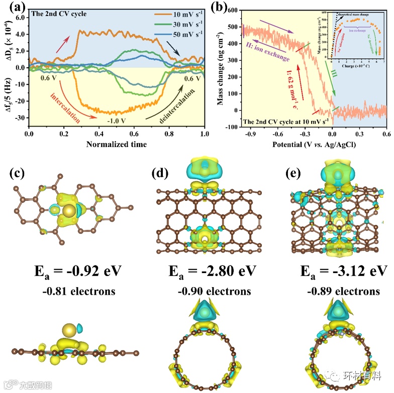 EQCM-D揭示了钠离子去除过程机制,DFT计算表明,HCl-NC电极的优异性能归因于类管状、高吡咯氮/吡啶氮比例以及石墨碳纳米畴所构成的协同作用结构。