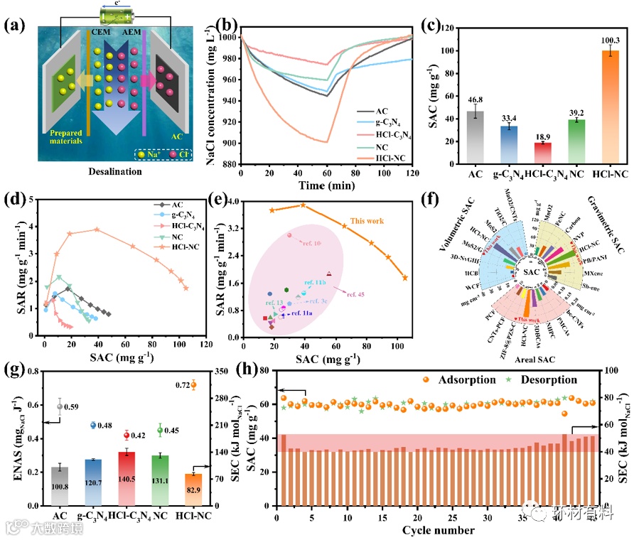 得到的高吡咯氮/吡啶氮比例的碳电极(HCl-NC)展现了高容量(100.3 mg g-1)、快速率(1.7 mg g-1 min-1)、低能耗(82.9 kJ molNaCl-1)以及优异长循环稳定性的除盐性能; -