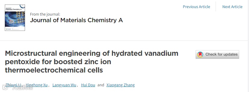 基于此,来自南京航空航天大学的张校刚教授课题组,在国际知名期刊Journal of Materials Chemistry A上发表题为“Microstructural engineering of hydrated vanadium pentoxide for boosted zinc ion thermoelectrochemical cells”的研究论文。南京航空航天大学2019级博士生李志伟为本文第一作者。