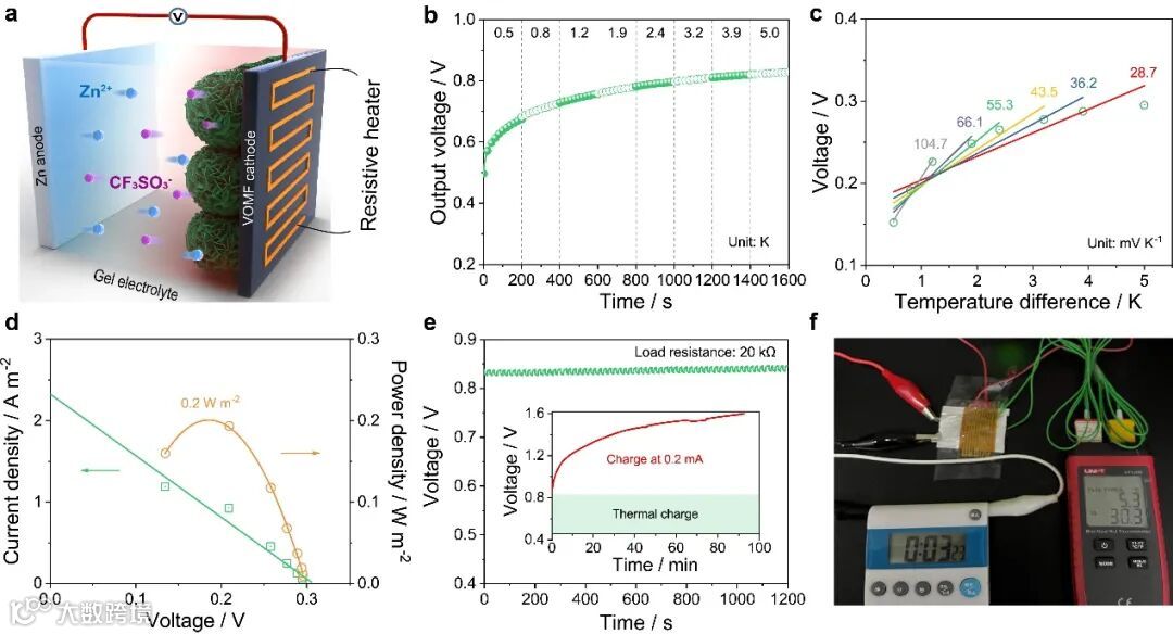 利用PAM-PAA凝胶电解质构筑了准固态ZTEC并测试了其热电转换性能。发现即便是在5 K的极小温差下,VOMF基ZTEC也能输出~0.8 V的电压和0.2 W m−2的热功率密度。值得注意的是,热充电后的ZTEC仍可以通过恒流充电过程将其输出电压进一步提高。作为潜在应用展示,仅一个ZTEC器件单元便能实现为小型计时器供能。