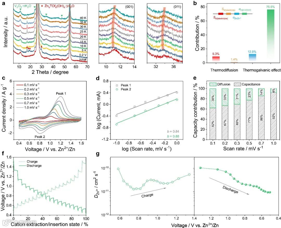 通过非原位XRD测试不同温差下VOMF的结构变化,发现VOMF基ZTEC主要依赖预嵌入VOMF离子的热脱嵌过程引起热氧化还原熵的变化,从而实现低品质热能向电能的转换。同时,利用等温三电极装置也验证了这种热氧化还原过程主导的过程。此外,通过CV和GITT测试对VOMF的动力学过程加以分析。显然,VOMF具有更高的表面赝电容以及更快的离子扩散行为。