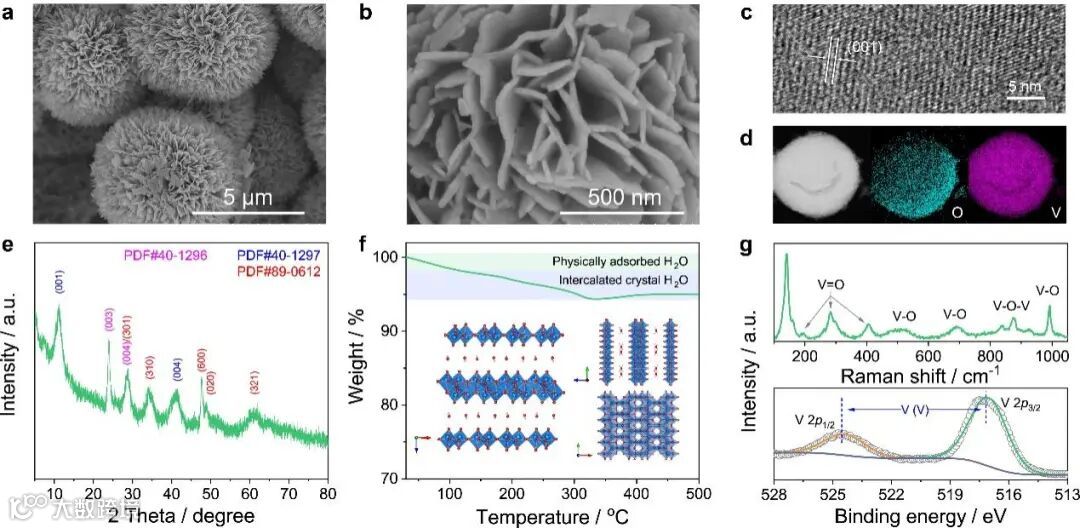 采用CTAB调控水合五氧化二钒微结构。可以发现VOMF中五氧化二钒片层会自发组装成花状微球,而VOMS则为实心微球,证实了CTAB对于五氧化二钒微结构调控的可行性。表征分析认为,VOMF主要晶型表现为V2O5·0.5H2O,其较大的层间距有利于离子的快速传输。