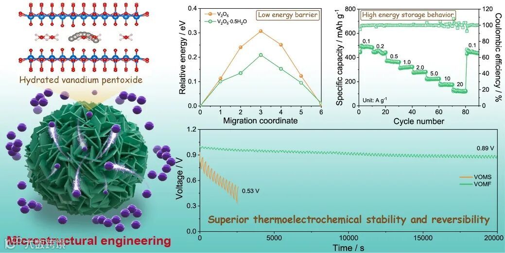 低品质热(<100 ºC)作为一种高熵值能量,广泛分布于环境和日常生活中,如太阳热能、地热能、工业余热、电子设备和身体自身散发的热量等。发展高效热能-电能转换体系对低品质热的回收利用将有望解决当前能源短缺的问题。其中,钒基锌离子热电化学电池(ZTEC)已成为低品质热收集和能量存储最为重要的候选体系之一。然而,钒基氧化物材料较差的稳定性和较低的利用率导致其构筑的ZTEC动力学迟滞且循环性能不佳。