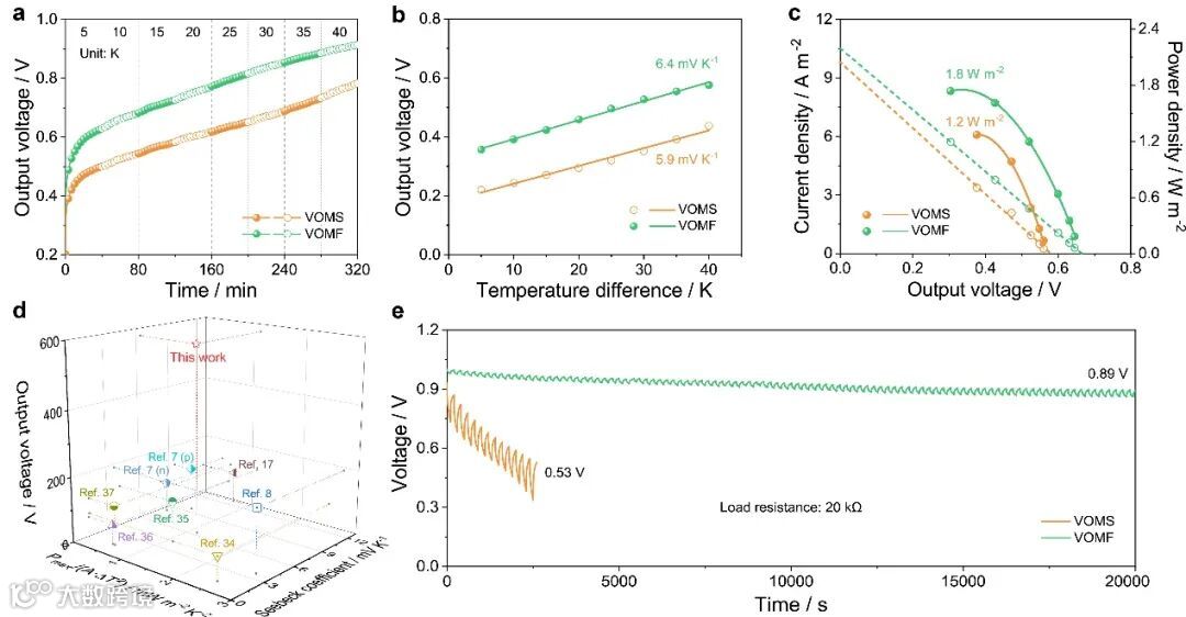 因此,VOMF具有更优越的热电转换性能(热电压:~0.6 V;塞贝克系数:6.4 mV K–1;最大热功率密度:1.8 W m–2)和更高的储能性能(493.9 mAh g−1@0.1A g−1;128.1 mAh g−1@20A g−1)。
