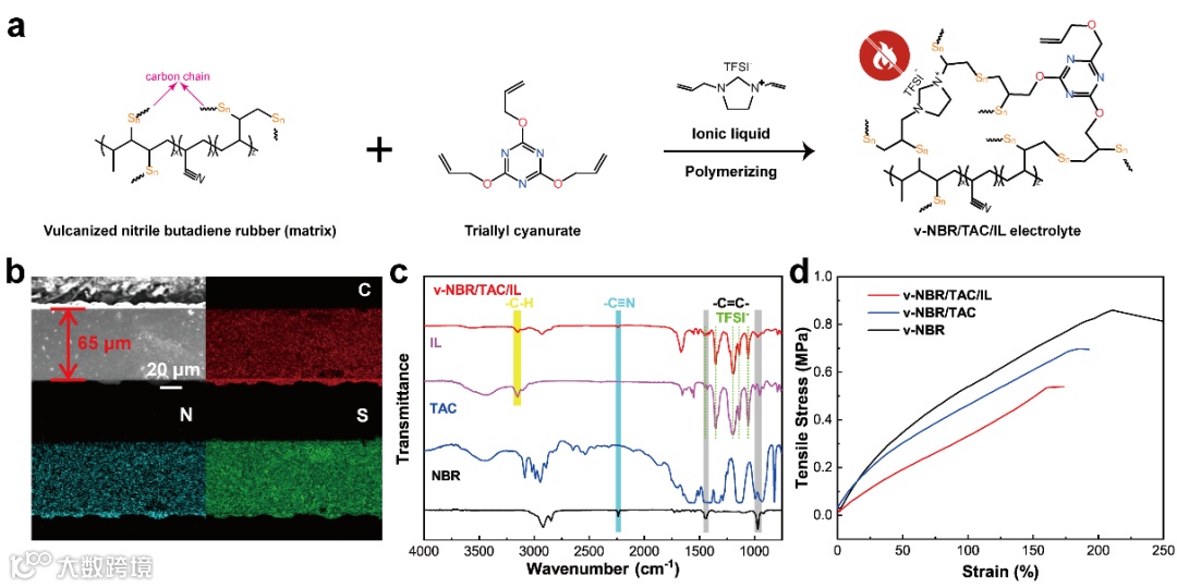 图1. v-NBR/TAC/IL电解质膜的合成示意图和表征。(a)v-NBR/TAC/IL电解质膜合成中的主要物质。(b)v-NBR/TAC/IL电解质膜横截面的SEM图像和相应的C、N、S元素的EDS图谱。(c)NBR、TAC、IL和v-NBR/TAC/IL电解质的FTIR光谱。(d)电解质的的应力-应变曲线。
