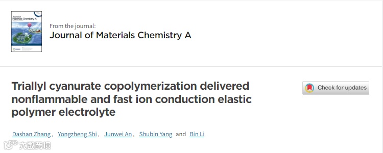 来自北京航空航天大学的李彬副教授及其合作者,在期刊Journal of Materials Chemistry A上发表题为“Triallyl cyanurate copolymerization delivered nonflammable and fast ion conduction elastic polymer electrolyte”的研究论文。