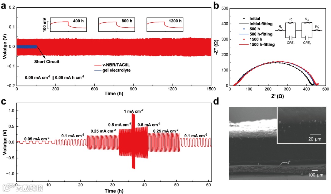 图4. 组装的锂对称电池的电化学性能。(a)锂电镀/剥离循环测试,相应的(b)使用v-NBR/TAC/IL电解质的对称电池的EIS图。(c)锂对称电池的倍率性能,相应的(d) 循环后金属锂负极截面SEM。
