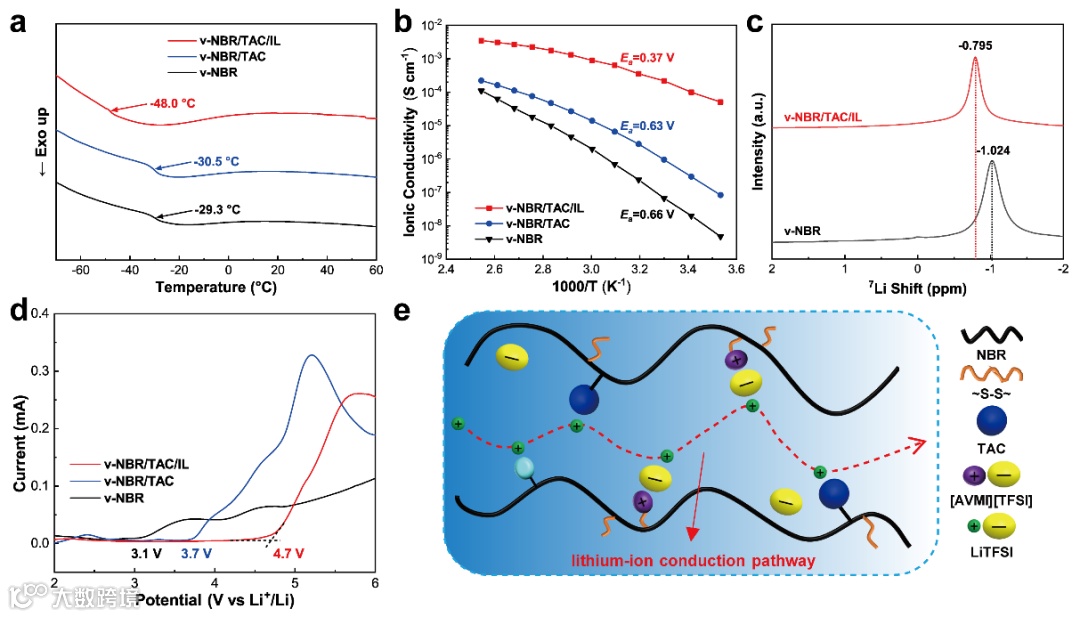 图3. v-NBR/TAC/IL电解质的电化学性能。(a)电解质的DSC曲线。(b)电解质的离子电导率。(c)v-NBR/TAC/IL和v-NBR电解质的7Li NMR光谱。(d)电解质的LSV曲线。(d) 锂离子在v-NBR/TAC/IL电解质中的传导示意图。