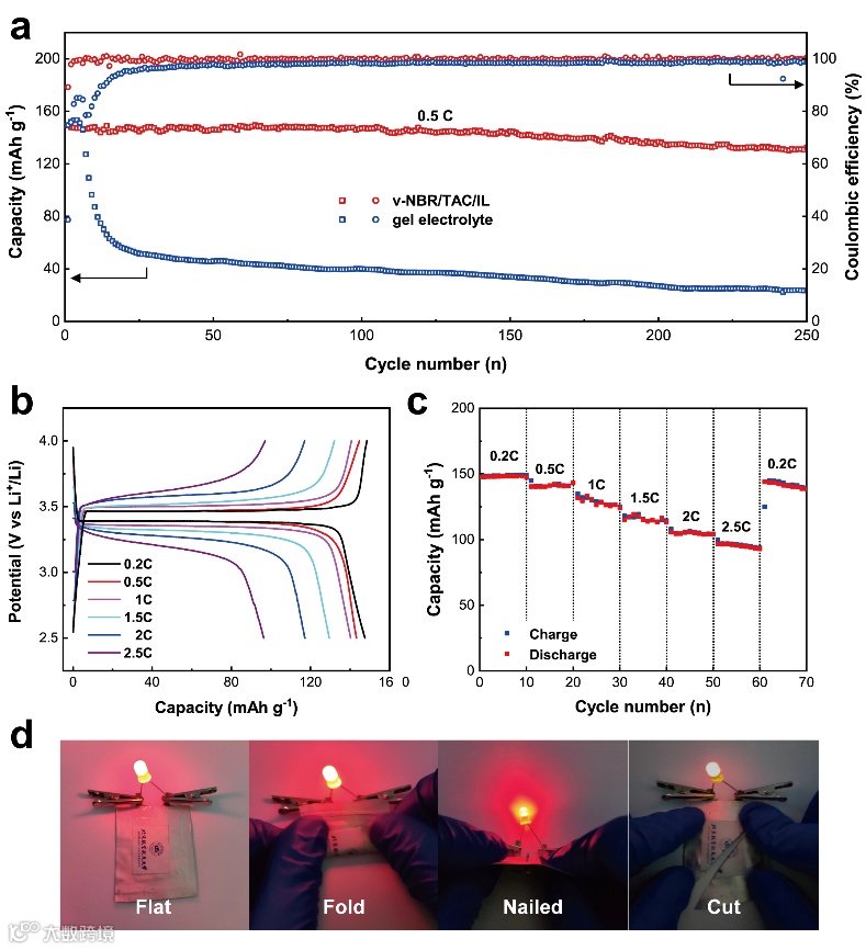 此外,该电解质在室温下表现出1.8×10-4 S cm-1的高离子电导率,使用橡胶基电解质的电池既有长期的稳定性,又有高的倍率性能。