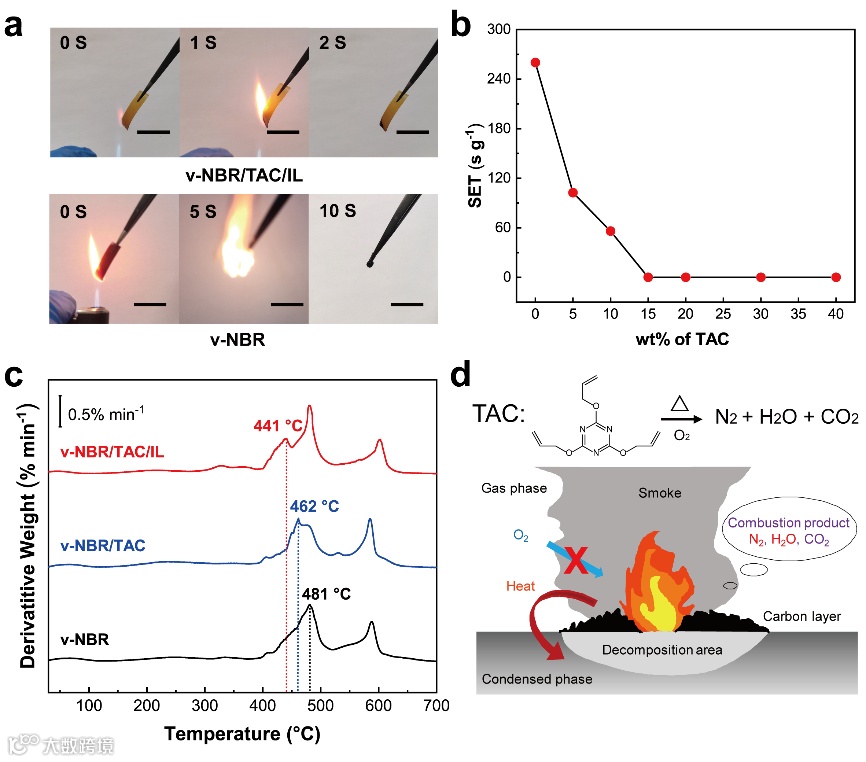 图2. v-NBR/TAC/IL电解质的阻燃性能。(a)v-NBR/TAC/IL和v-NBR电解质膜的燃烧试验。(b)TAC不同含量的v-NBR/TAC/IL电解质的SET。(c)电解质在空气中的DTG曲线。(d)v-NBR/TAC/IL 电解质的阻燃机理。