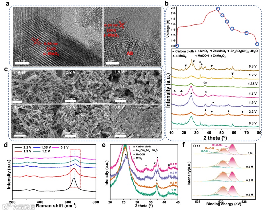 在放电过程中,反应二和三存在竞争关系,由于MnO2/Mn2+反应放电电压高,并且消耗大量质子,质子嵌入反应被抑制,从而歧化反应造成的锰溶解得到限制,电池循环稳定性得到提高。于此同时,MnO2/Mn2+反应的引入,显著提高了体系的能量密度。最终,锌锰电池实现了858 Wh/kg基于α-MnO2的质量的高能量密度以及7000圈的长循环。