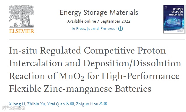 其成果以题为"In-situ Regulated Competitive Proton Intercalation and Deposition/Dissolution Reaction of MnO2 for High-Performance Flexible Zinc-manganese Batteries"在国际知名期刊 Energy Storage Materials 上发表。本文第一作者为李锡龙博士,通讯作者为钱逸泰教授,侯之国副教授,通讯单位为中国科学技术大学。