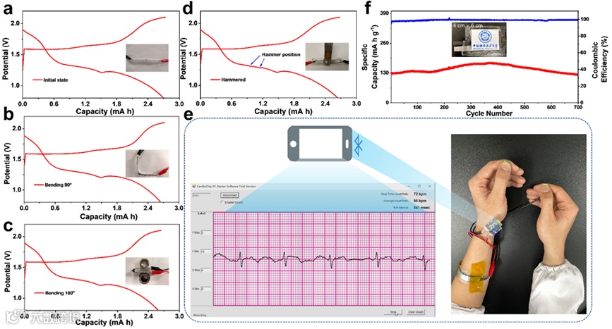 图5. 不同工况下的HCH基柔性锌锰电池性能。
