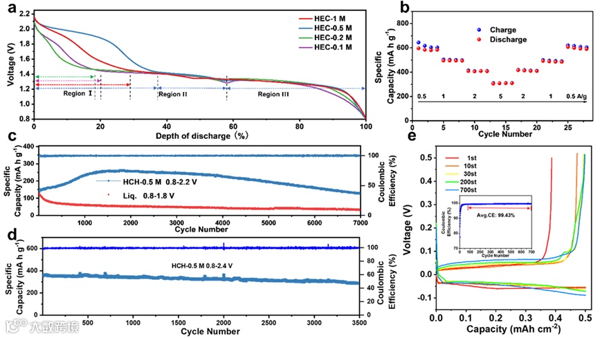 MnO2||HCH||Zn全电池经过7000次循环后,在0.8 ~ 2.2 V电压范围内的容量保持率为93.5%,以阴极质量为基准的能量密度为858 Wh/kg。实现能量密度和循环寿命同时提高。