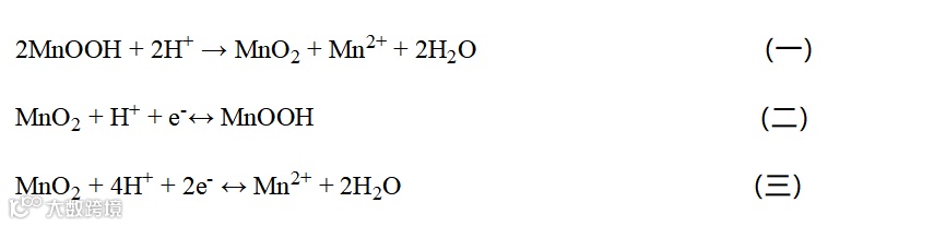 本文提出一种基于MnO2沉积溶解反应和质子嵌入反应的竞争反应机制,放电过程中,MnO2沉积溶解反应与质子嵌入反应竞争消耗质子。放电过程中,由于MnO2沉积溶解反应优先发生,质子嵌入反应得到极大的抑制,从而减少MnOOH的生成,进而降低由MnOOH歧化反应造成的锰溶解。