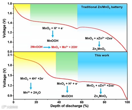 基于此,中国科学技术大学钱逸泰教授&侯之国副教授团队提出一种竞争反应机制原位调控质子嵌入反应,减少MnOOH生成,减少锰溶解。具体来说,通过耦合高交联密度的水凝胶电解质,在弱酸性电解质中实现MnO2/Mn2+两电子反应(反应三)的可逆充放电。
