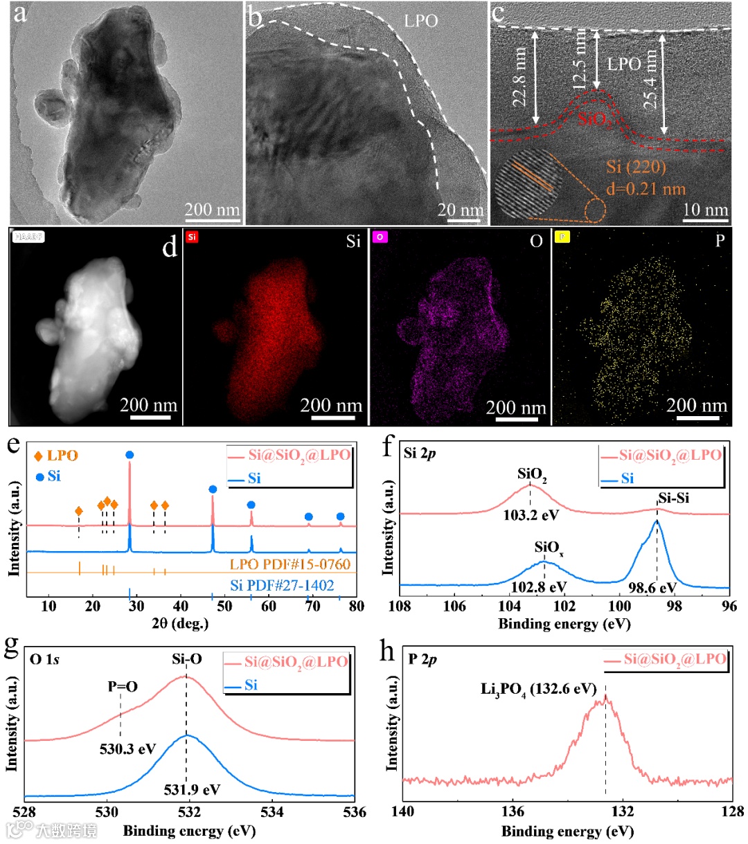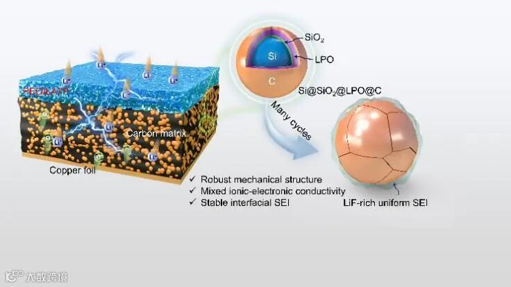 鉴于此,南京林业大学韩响、陈继章课题组联合厦门大学张桥保团队等人通过固相加热的方法合成了磷酸锂 (Li3PO4)和碳双包覆微米Si (Si@LPO@C)的核壳结构(图1和图2)复合负极材料,能够有效缓解硅在充放电过程中体积膨胀产生的应力,保持结构完整性,原位形成的无定形SiO2纳米层又可以降低Li+从Li3PO4(LPO)层到Si颗粒的传输能垒,有助于Li+的快速传输,优化了结构稳定性和输运动力学,实现了其在液体和固态电池中倍率和循环性能的协同提升。