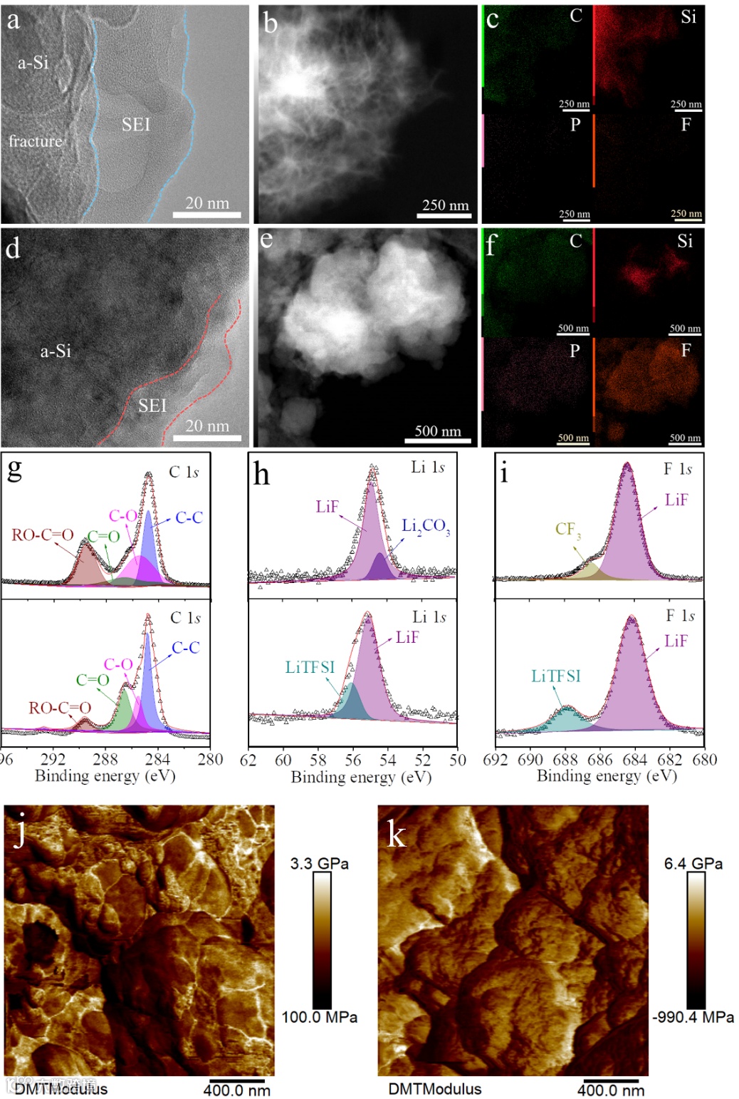 这种由厚SEI包裹的Si结构显示出高的Li+电阻和低的电化学活性,从而导致相应的快速容量衰减。相比之下Si@SiO2@LPO@C在固态电池循环中显示出完整的颗粒形态和均匀的SEI层。观察到Si的信号位于循环后颗粒的中心,而C和F信号包覆在表面上。SEI的主要成分是LiF,这有助于Li+的快速转移并抑制Li金属的体积变化。在固态电池中,SEI的化学成分和空间分布与液体电池中的不同,表现出高机械稳定性,有助于适应体积变化。
