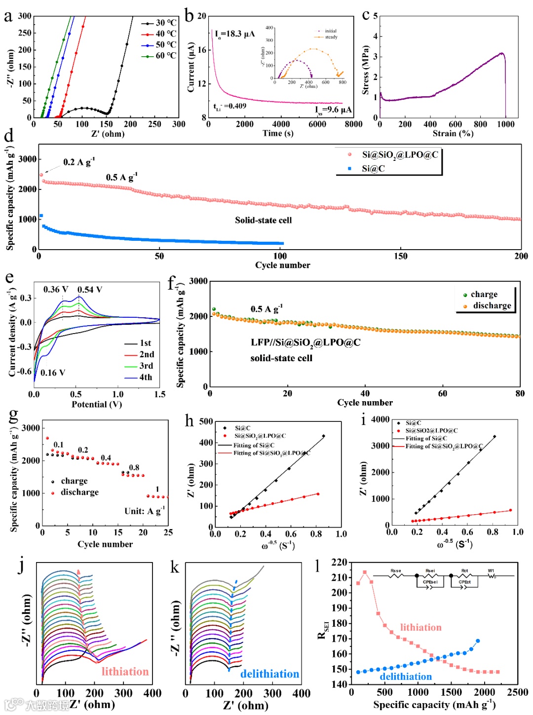 3.3固态电池的电化学性能 (图5)。PEO/LATP固态电解质在50 ℃的离子电导率达到2.8610-4 S cm-1,且能够达到950 %应变。Si@SiO2@LPO@C电极在固态电池中表现出2482.1mAh g−1的可逆比容量和88.7 %的首效,几乎与液体电池中的电极相同。即使在0.5 A g−1电流密度下,比容量仍保持在2279.3 mAh g−1,表明Si@SiO2@LPO@C电极在固态锂化和脱锂过程中仍具有快速的动力学。