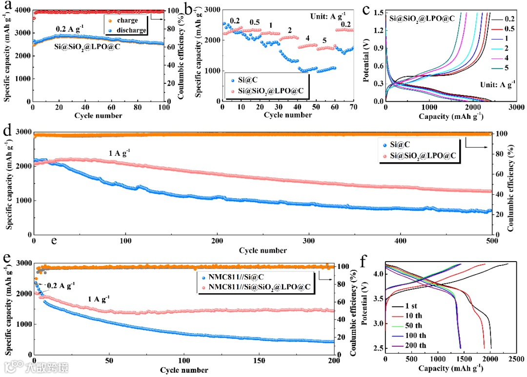 尽管存在绝缘SiO2层,离子导体LPO/SiO2有助于Li+的快速传输,Si@SiO2@Li3PO4的室温离子电导率为1.8710-4 S cm−1。由于具有高模量的陶瓷LPO/SiO2有助于在锂化和脱锂过程中释放应力,因此即使体积变化较大,LPO/SiO2形成的Li+通道也可能保持稳定。Si@SiO2@Li3PO4@C电池在1 A g−1循环500次后还有1272.1 mAh g−1的容量。作者还制作了与NMC811正配对的全电池,Si@SiO2@LPO@C电极显示出2018.2 mAh g−1的容量和86.4%的首效,在200圈后容量还有1440.6 mAh g−1。