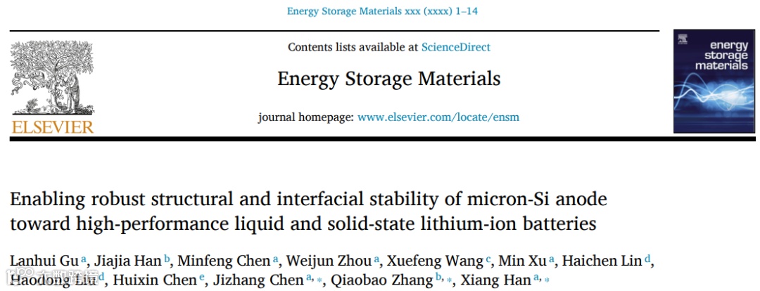 Lanhui Gu, Jiajia Han, Minfeng Chen, Weijun Zhou, Xuefeng Wang, Min Xu, Haichen Lin, Haodong Liu, Huixin Chen, Jizhang Chen*, Qiaobao Zhang*, Xiang Han*, Enabling robust structural and interfacial stability of micron-Si anode toward high-performance liquid and solid-state lithium-ion batteries, Energy Storage Materials,
