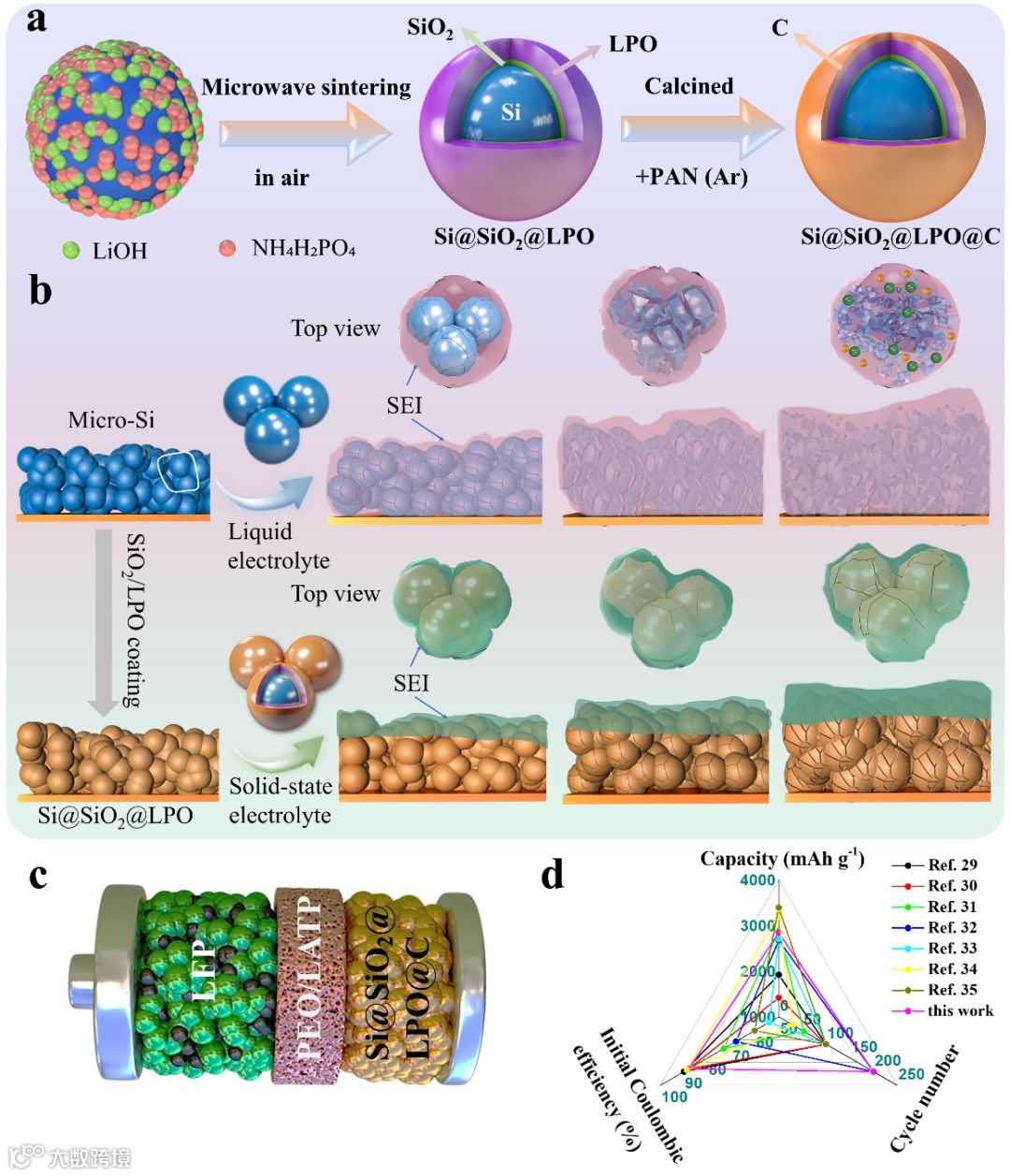 图1 基于Si@LPO@C负极和PEO/LATP固态电解质的固态电池的示意图与性能提升机制。