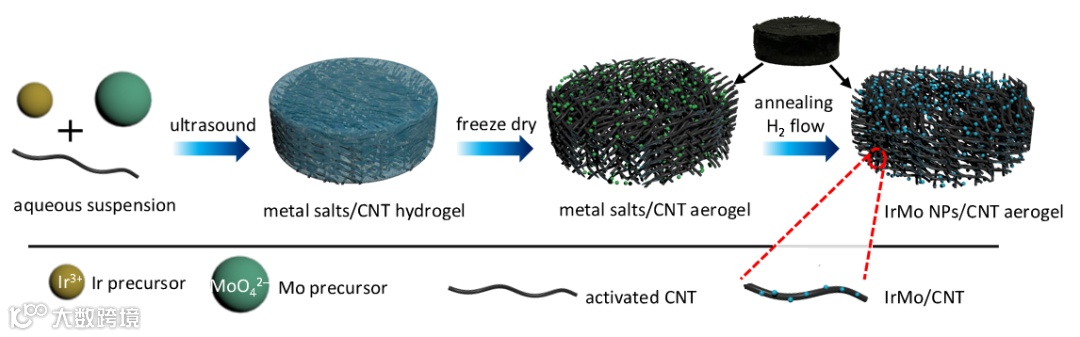 金属盐水溶液与亲水CNT经超声处理后,通过亲水CNT间的交联作用形成水凝胶。水凝胶经冷冻干燥升华溶剂后,金属盐将均匀负载于所得的碳纳米管气凝胶,最后经还原性气氛中热处理即可得到CNT负载的IrMo金属间化合物催化剂。
