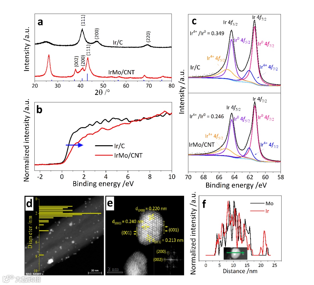 a, XRD图。b, 价带谱分析。c, Ir 4f XPS光谱分析。d, HAADF/STEM形貌分析。e, IrMo纳米离子的原子级分辨率HAADF/STEM分析。f, IrMo纳米颗粒的线扫能谱分析。