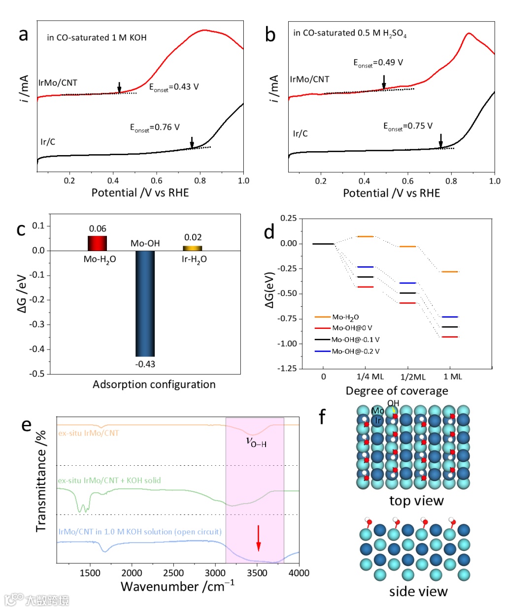 a, IrMo/C和Ir/C在CO-saturated的1 M KOH溶液中的LSV曲线。b, IrMo/C和Ir/C在CO-saturated的0.5 M H2SO4溶液中的LSV曲线。c, IrMo (001)面不同位点对H2O、OH的吸附能。d, IrMo (001)面上Mo位点对H2O和OH的吸附能。e, 红外光谱分析。f, DFT计算模型。