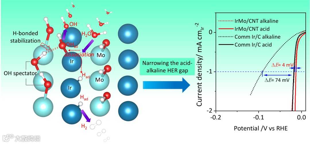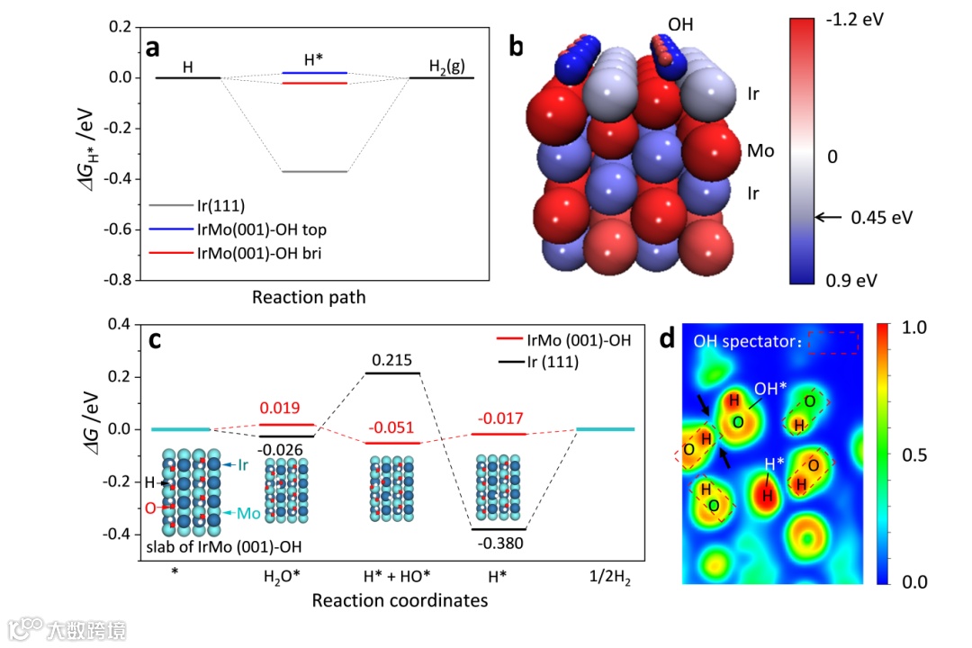 图1. 表面吸附OH配体的IrMo金属间化合物催化碱性析氢反应路径及效果图。